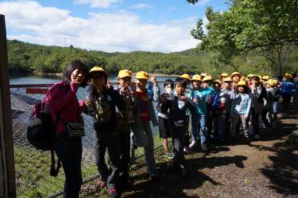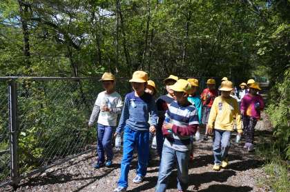 焼き杉工作が早く終わったので、クラスごとにお散歩に行きました。築水池のほとりを通ってトリムに抜ける、山あり、谷あり、川渡りありの、なかなかハードなコースを歩きました。