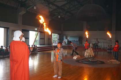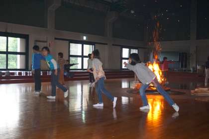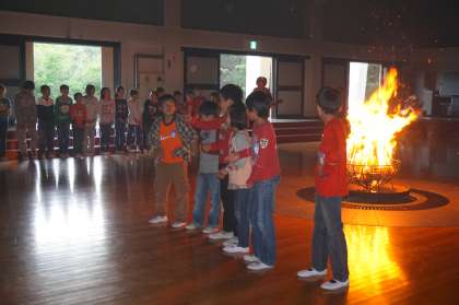 地面がぬかるんでいて、しかも風が強かったため、キャンプファーヤーは予定を変更し室内で行いました。プレイホールでも十分楽しむことができました。