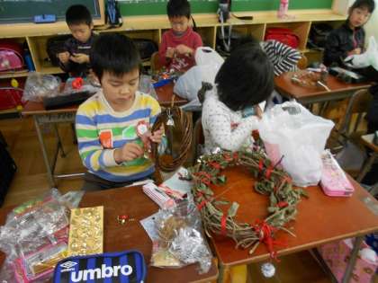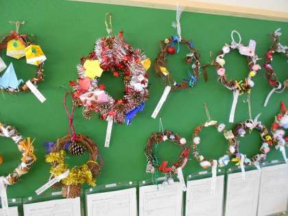 1年 リースが完成しました! 公開日 2015/12/03 更新日 2015/12/02 学校の様子 夏に育てた、あさがおのつるから作ったリースに飾り付けをしました。子どもたちはクリスマスの話をしながら楽しそうに制作していました。たくさんの飾りを持たせていただきありがとうございました。持ち帰りましたら、どこかに飾ってくださいね。