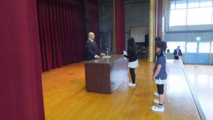 新しく転任された先生方の紹介、1学期始業式、児童会役員の認証、1年生との対面式。その後、各教室で、担任の先生との出会いの時間となりました。