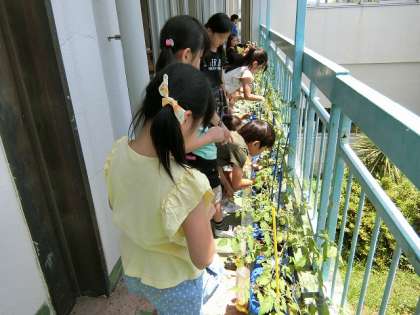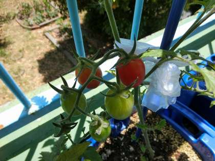 ベランダのトマトも少しずつ色づきはじめました。収穫をして家に持ち帰り食べるようにしています。一つずつですが、味わってください。