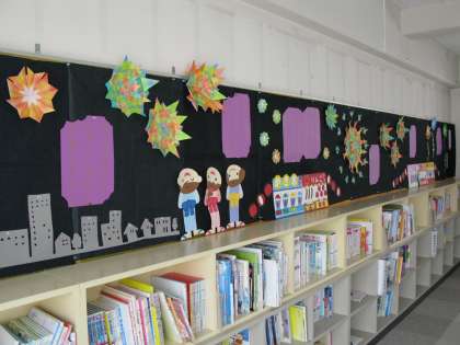 読み聞かせ「じんたん」の方々で、第2図書館の掲示をリニューアルしました。図書館に2時間目の放課に来る児童も折り紙を作製してくれました。壁一面にすばらしい掲示になりました。