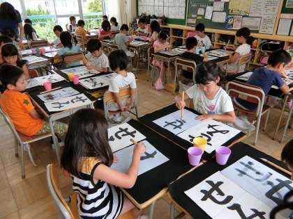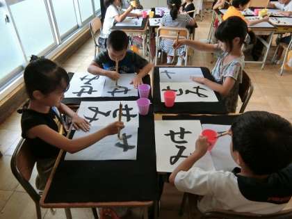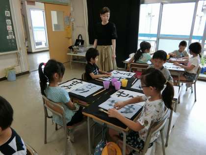 書道科の先生がみえて、水習字で「せみ」の字をかきました。水習字にも慣れてきて手際よく作品を作っていました。
