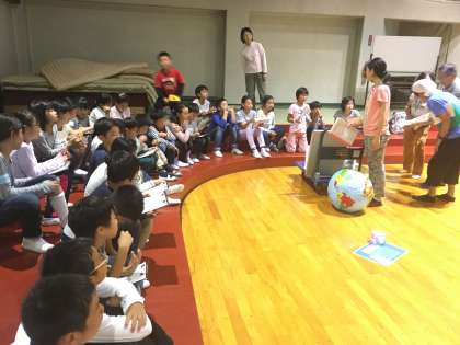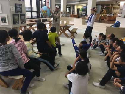 ハイキングから戻り、クラスごとにプレイホールとラウンジに分かれ、ガイドさんを講師に、水と雨についてのゲームをしながらの学習です。