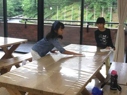 食堂での食事の時には、毎回、食事係が自分たちの班のテーブルを拭いてくれています。