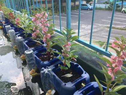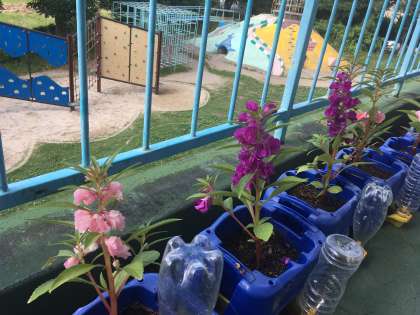 3年生の教室のベランダでは、子どもたちが理科の学習で育てているホウセンカが花を咲かせています。