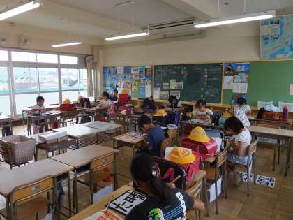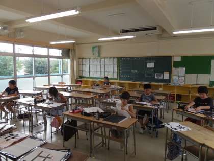 席上揮毫大会、校内選考会が行われました。夏休みの間に、一生懸命練習した成果を発揮しようと、どの子も真剣に取り組んでいました。