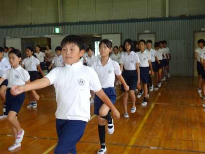 今日も昨日に引き続き、「集団行動」の練習です。今日のメインは行進です。手を振る角度や列を揃えること、一言で行進といっても注意しなければいけないポイントはたくさんあります。また、後半では行進をしながら回れ右をしたり、方向転換をする練習もしました。明日は騎馬戦の練習をします。