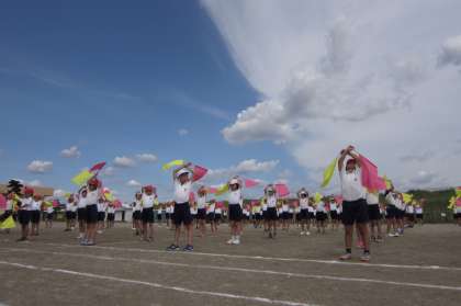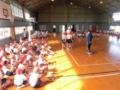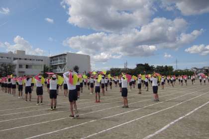 天気も良く、運動場でフラッグの練習をすることができました。「ありがとうの輪」に合わせて、ピンクと黄色のフラッグをはためかせました。