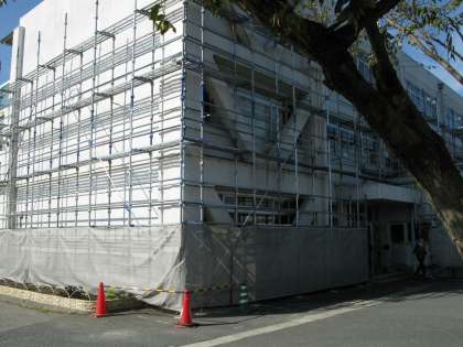 2学期中に、校舎の防水と外壁塗装工事が行われます。職員室がある棟に足場が組まれました。来校する方々には、駐車場等でご迷惑をかけます。ご理解とご協力をお願いします。