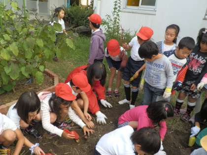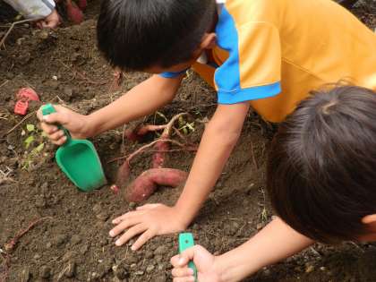 春に永草さにん教えてもらって、さつまいもの苗を植えました。そして先日、25日にいも掘りをしました。「あったよ!」「大きなおいもだね。」「根っこが長く続いているよ。」など、子どもたちの歓声が聞こえました。