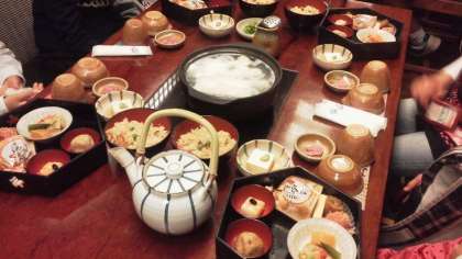 晩ご飯は順正 おかべ家の湯豆腐付き定食です。おいしそうですね。子どもたちの様子が写ったメールも届かないかな??