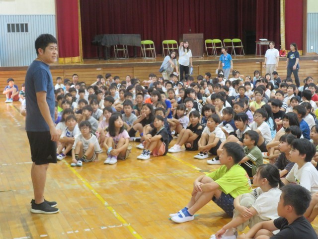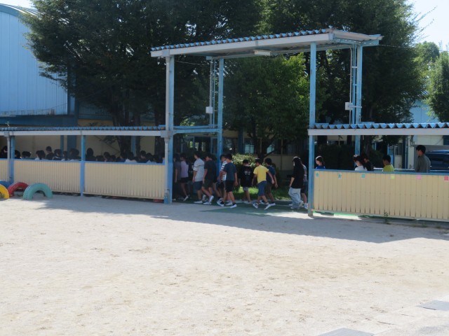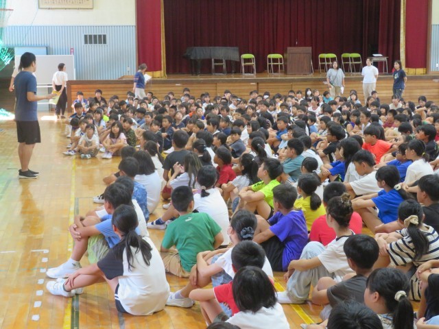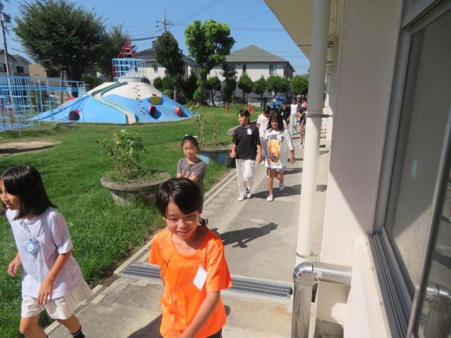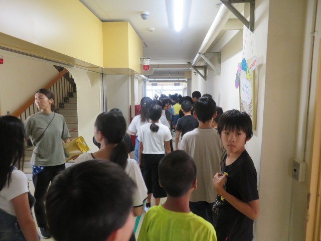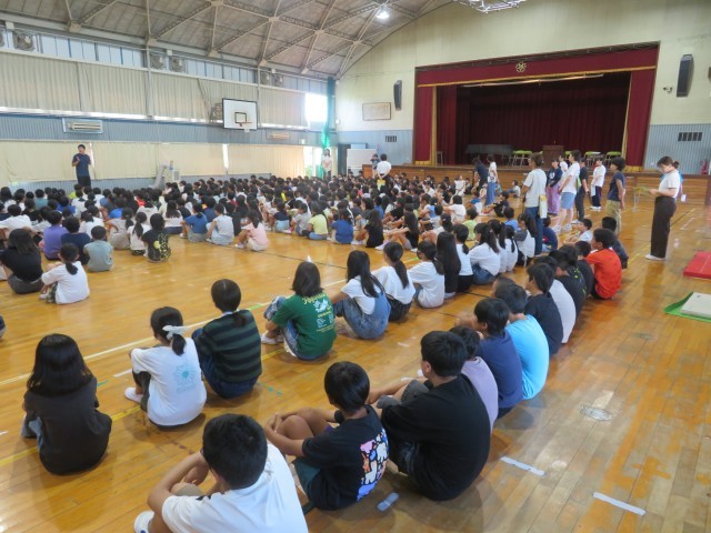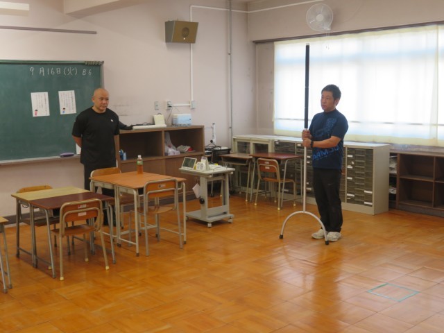 保健室に侵入した不審者を先生方がさすまたを持ちながら対応し、その間に職員室から110番通報し、全児童は体育館へ避難しました。