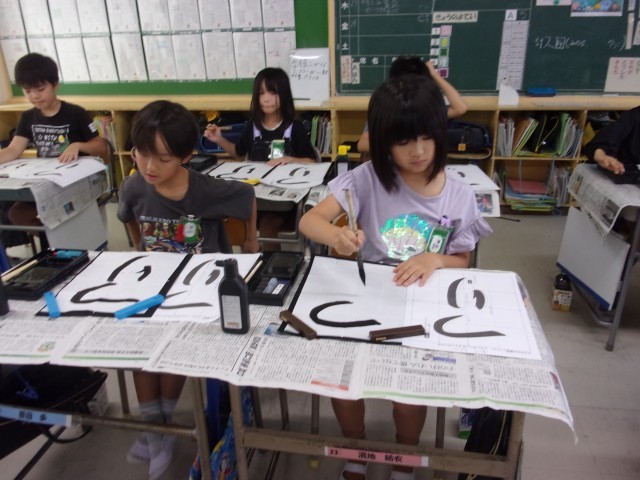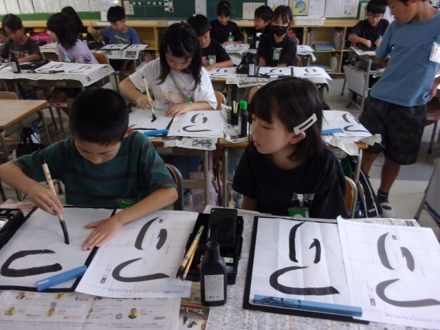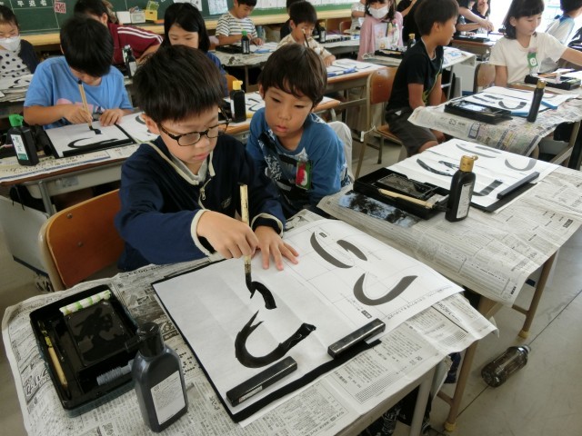 2人組になって、お互いに見合いながら集中して「つり」という字を書くことができました。