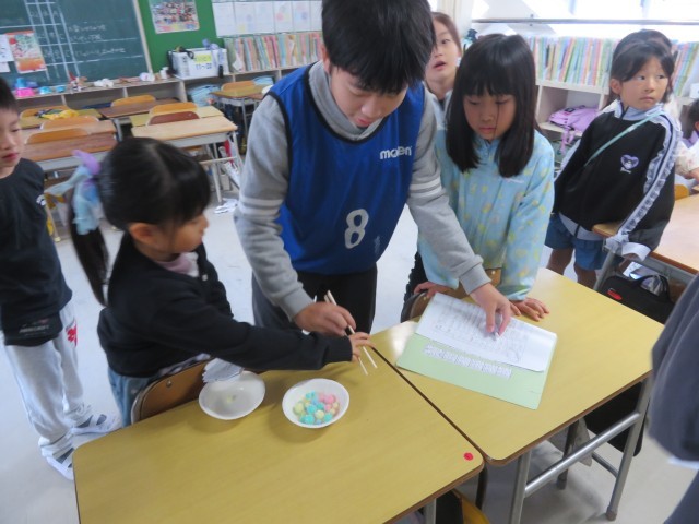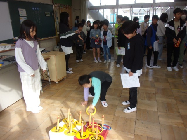 10/23(木)お楽しみ集会がありました。今回のテーマは「米粒を集めておむすびをつくろう」!!ふれJ班で学校を回り、ゲームに参加すると米粒(シール)がもらえ、8つたまるとおむすびになるというものです。そのゲームは代表委員の企画運営によるもので、ボーリングやわなげ、バスケシュートや以心伝心ゲームなど工夫されたものが14つありました。