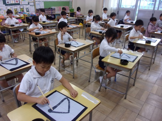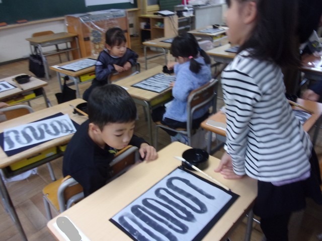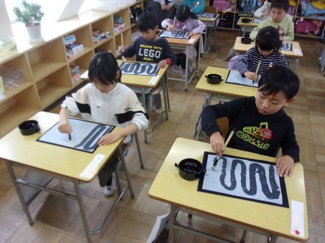 筆の持ち方、姿勢などの5つのルールを復習した後、三角→のり→梅干しの順でおにぎりを書きました。