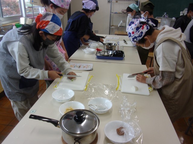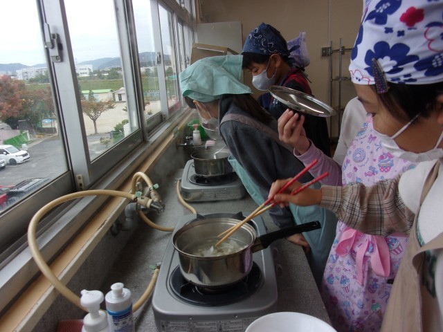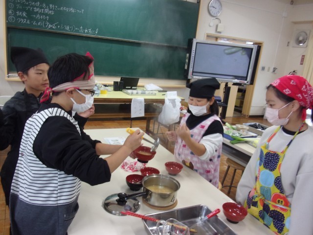 今日は、1組の調理実習がありました。煮干しの頭やはらわたを取り除いて、だしの準備から片付けまでグループの友達と協力して行っていました。出来上がった味噌汁を「おいしい」と言いながら試食していました。