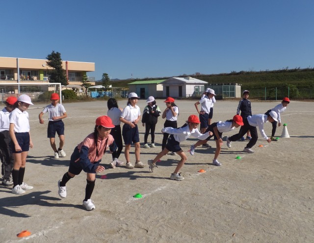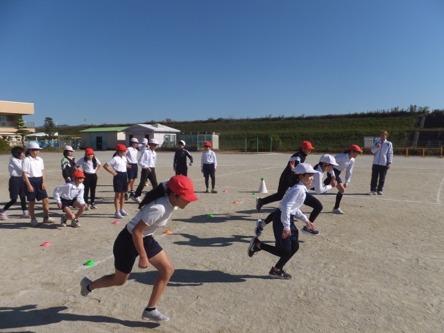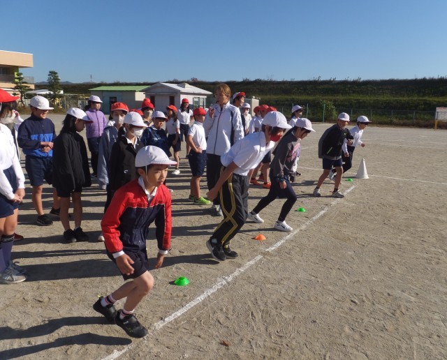今日は、講師の先生から短距離走の指導をしていただきました。足の裏を全部つけて走らない練習や重力を利用してスタートを切る方法などを教えていただきました。寒さに負けずに、子どもたちは元気よく走っていました。