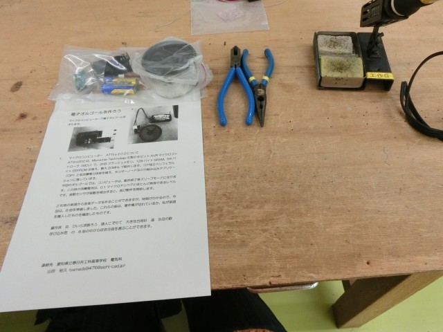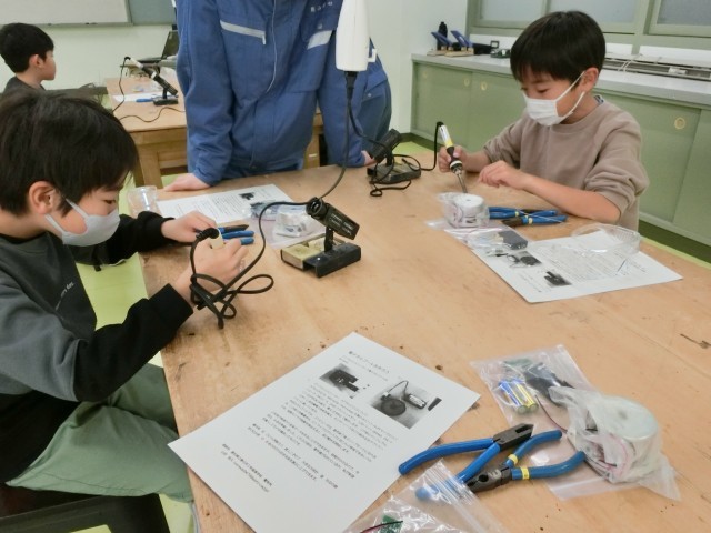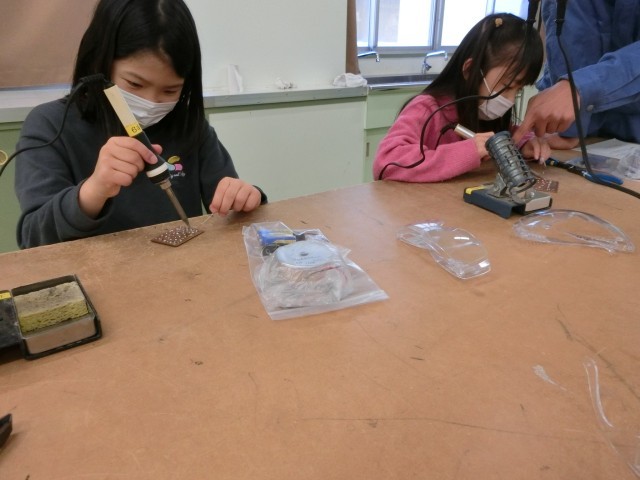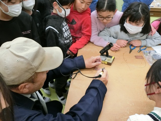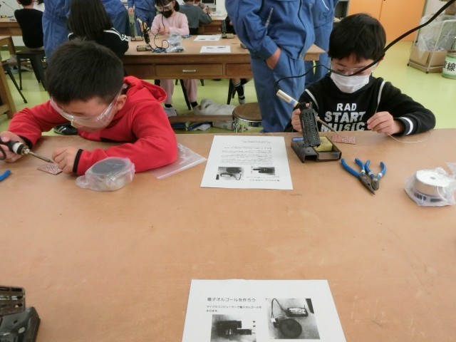 オルゴール作りは、主にはんだごてを使いました。できあがって、先生にお願いするとたくさんの曲の中から1曲入れてもらえます。神領小学校の校歌が一番人気でした。時間内に完成しなかったので、修正をお願いしてきました。来週にはできあがってきます。楽しみに待ちましょう。