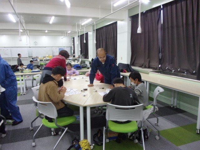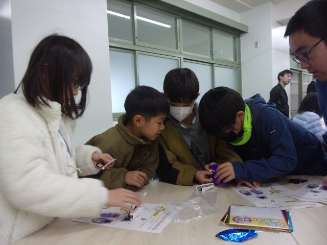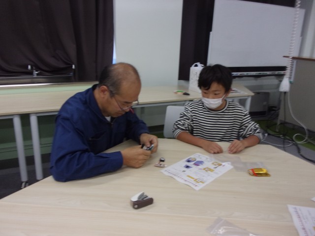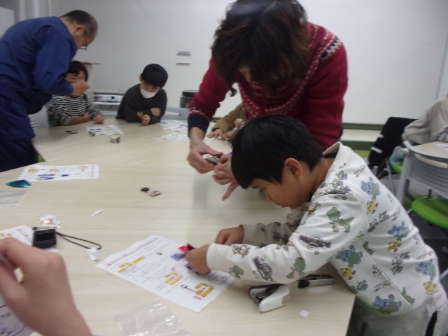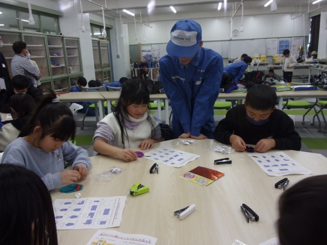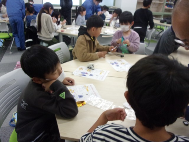 折り紙を使ってホタルを作りました。ランプや電池を使いおしりが光るようにしました。
