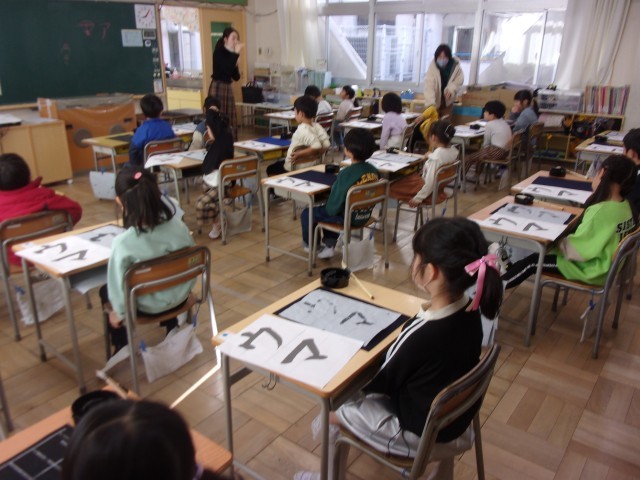 みんなよく覚えていて、ルールを意識しながら来年の干支「午」をカタカナでかきました。