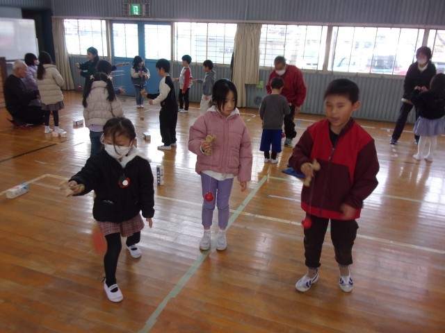 けん玉やこま、ヨーヨーは、上手くできるコツを教えてもらったり、お手玉は技を見せてもらったり、一緒に羽根つきをしたりしました。