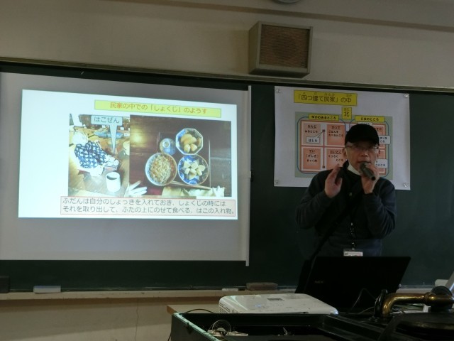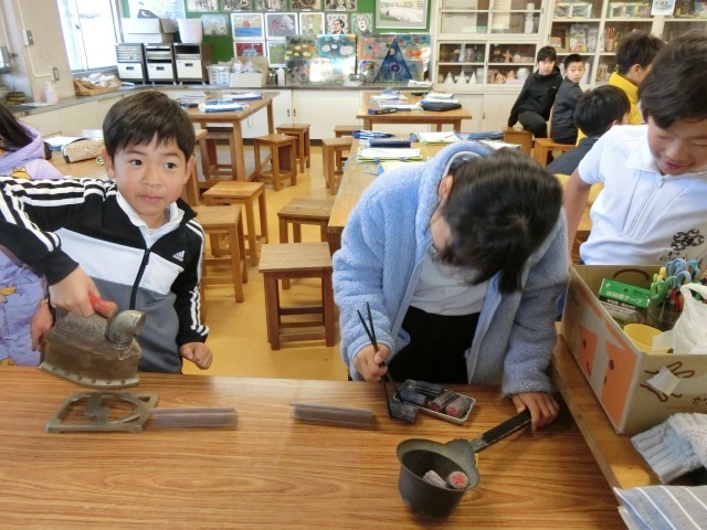 昔のくらしの出前授業を行いました。いろいろな道具を見せてもらい、実際に手に取って使い方など教えていただきました。また、「四つ建民家」についも教えていただきました。子どもたちは今のくらしの便利さを感じたことと思います。