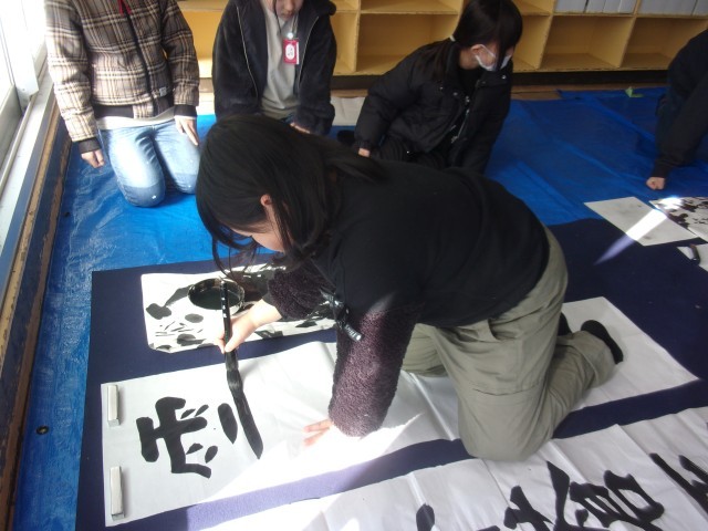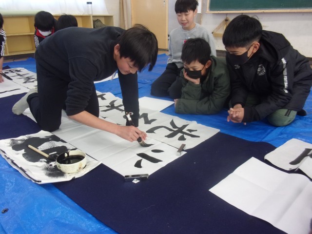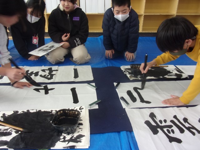 今週の月曜日の書写の時間に、大きな紙に大筆を使って字を書きました。講師の先生から書き方の指導を受けました。子どもたちは、四字熟語を友達と協力して書き上げることができました。