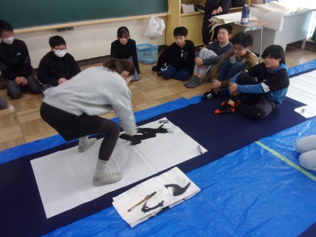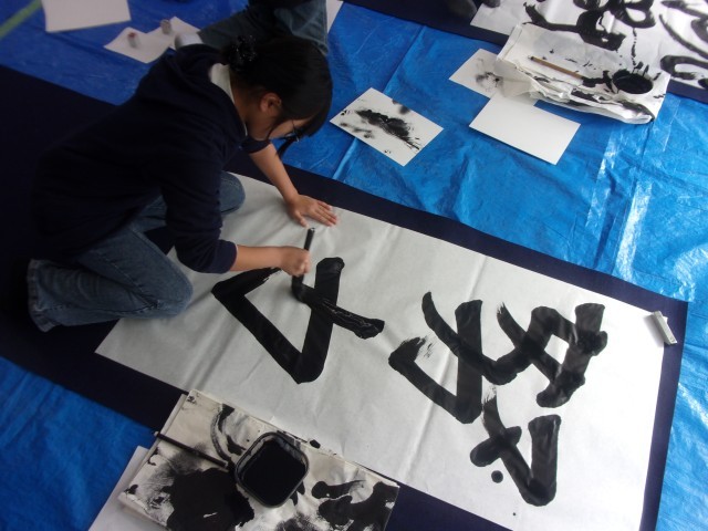 最初は蘭月先生にお手本を見せていただきました。圧巻の字にみんなの目が丸くなっていました。