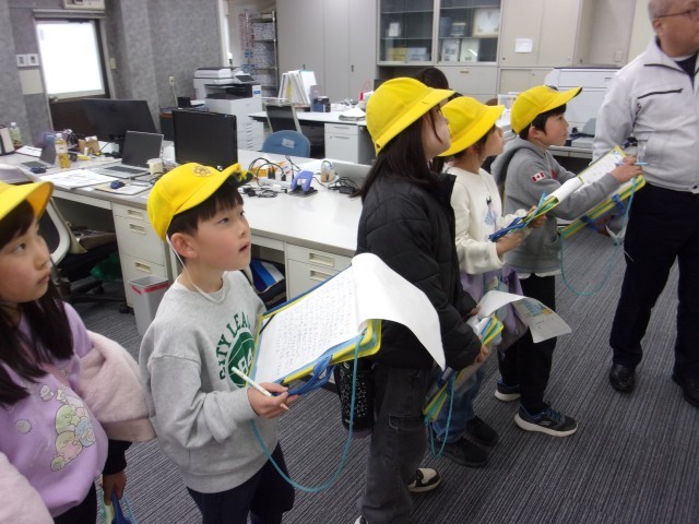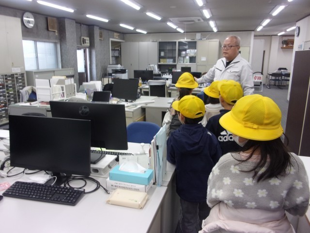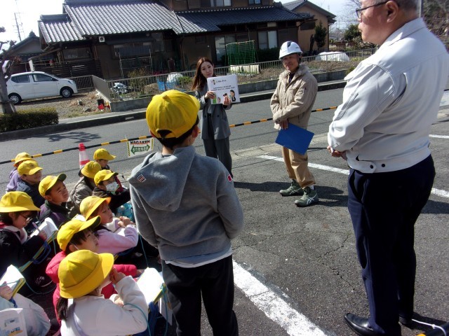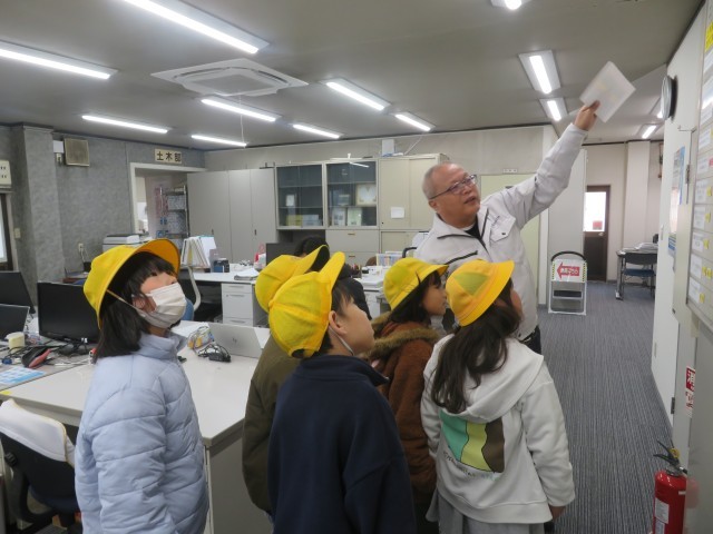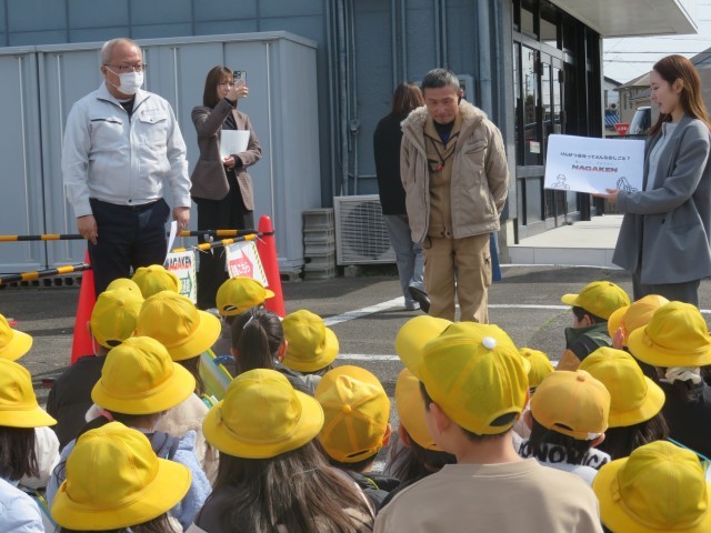NAGAKENさんの3つのお仕事、 ①たてる:家、病院、幼稚園などの建物をたてる。②まちをつくる:道路、橋、ロータリーなどを作る。③まもる:建物や道路が壊れていないか調べ、みんなが安全に過ごせるようにしている。など資料を準備していただき、とてもわかりやすく教えていただきました。私たちの身近にもたくさんの永賢組さんが造ったところがあると知り驚きました。今日遊んだ高御堂公園も手掛けたところです。神領校区に、私たちのまちをよりよくしてくださる会社があることを学びました。