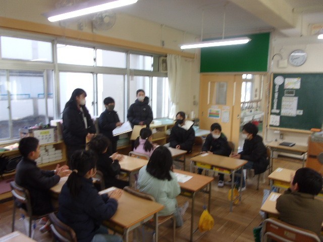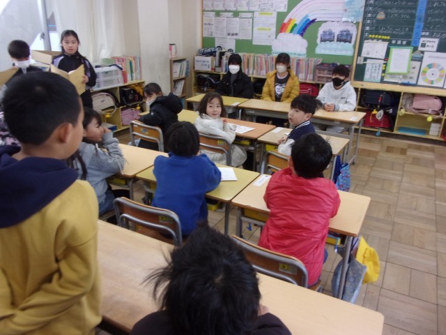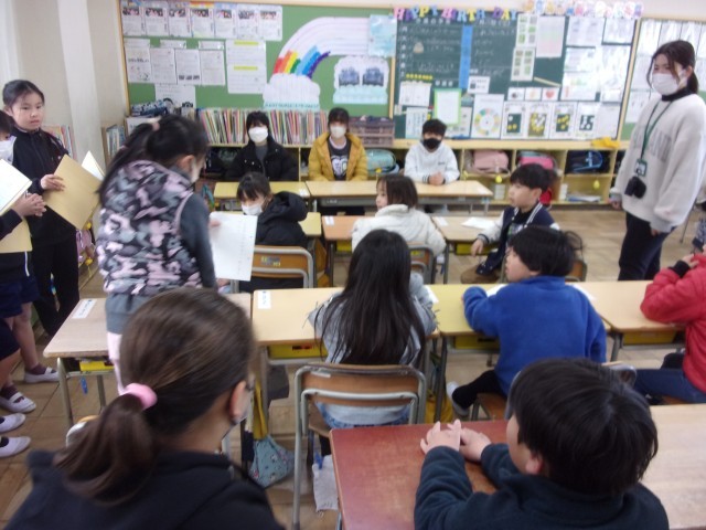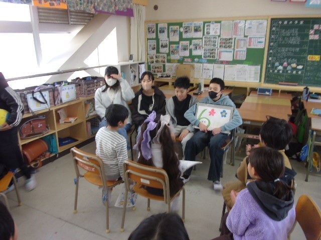 6年生を拍手で迎え、一人一人がお礼の言葉を伝え、1年生から5年生で作った贈り物を手渡しました。