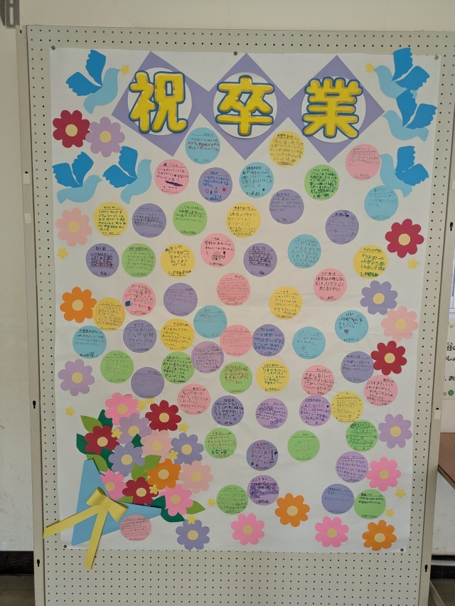 昇降口に、6年生に向けてのメッセージカードのコーナーを設置してくださっていて、たくさんのメッセージで飾られています。