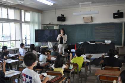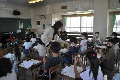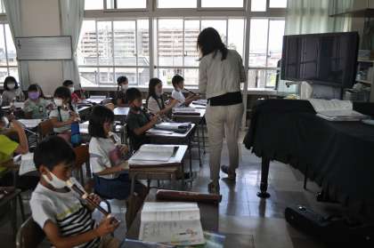 3年生の音楽は「こんにちはリコーダー」の単元を行っています。前半は、リコーダーで「シ」と「ラ」の指使いを習い、一人一人吹いてみて、正しく吹いているか確認しました。それから、「ゆかいなまきば」に入り、「ソ」の指使いを教わりました。