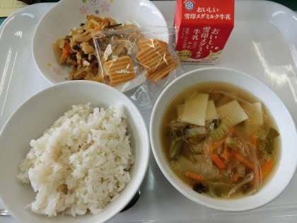 麦ご飯 牛乳 雲呑スープ チャプチェ きらず揚げ