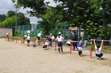 5年生の体育(外)は「水泳」と並行して「器械運動〜鉄棒運動〜」の単元に入りました。今日はオリエンテーションで、今できる技の確認をしました。