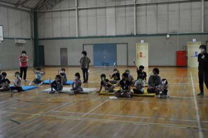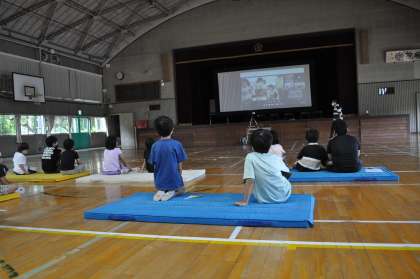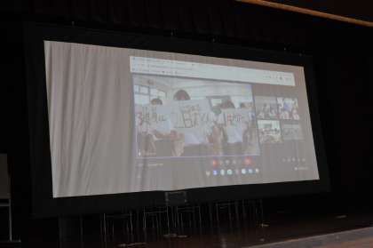 9時から体育館でブロック交流会を行いました。昨年同様、オンライン形式で行われたので、スクリーンに映っている他の学校の様子をみることができ楽しそうでした。特に、知多中学校の紹介では、本校でいっしょに生活した先輩が出てくると盛り上がっていました。