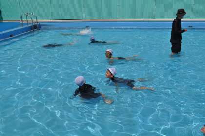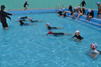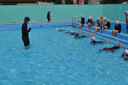 2年生の体育は、プールで「水遊び」をしました。山王小学校のプールにはじめて入るので、今年は水に慣れることをめあてに行っていきます。今日は「ワニ歩き」を中心に練習をしました。
