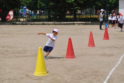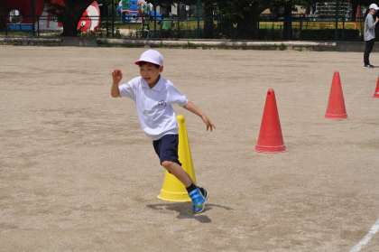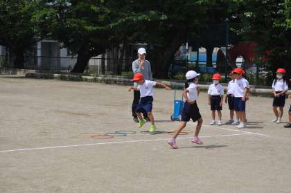 1年生の体育は「走・跳遊び」の単元を行っています。前後・左右跳びや川遊びをしてから、ケンパー跳びからジグザク走りをしました。
