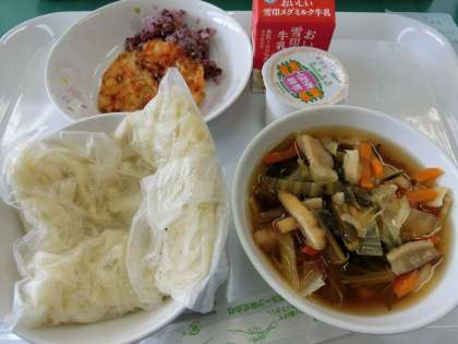 五目きしめん 牛乳 愛知県産野菜かき揚げ キャベツのゆかり和え 愛知県の蜜柑ゼリー
