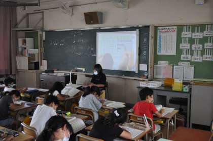 2年生の音楽は「リズムや ドレミと なかよし」の単元を行っています。「全音符」「2分音符」「4分音符」「8分音符」について学習しました。