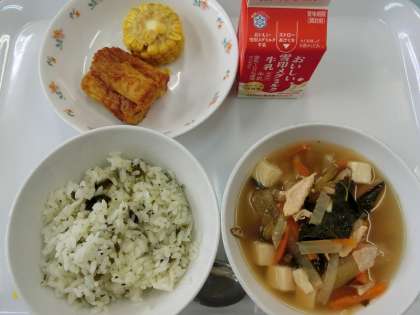 わかめご飯 牛乳 五目汁 ちくわのカレー揚げ カットコーン