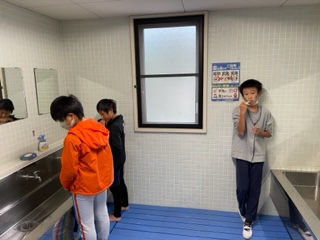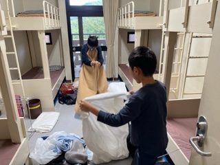 起床時刻と同時に、朝の身支度と寝具の片付けに取り組みます。昨日の活動の疲れが残っている子もいますが、今のところはケガや体調不良もなく、みんな元気にしています。