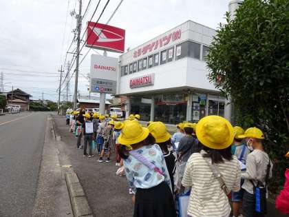 1学期とは違い、今日は302号線よりも南側を回りました。どんな店があるのか、どこに子ども110番があるのかなど、確認しながらたんけんすることができました。