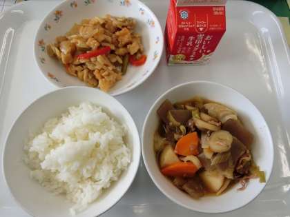 ご飯 牛乳 芋煮 鶏肉と蓮根の甘酢和え