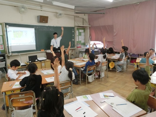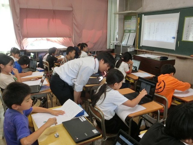 1年生は、音楽の授業で鍵盤ハーモニカの練習をしました。子どもたちは、ドレミの音を伴奏に合わせて出していました。2年生は、実習先生の算数の授業を行いました。数の増え方について、いろいろな考え方ができることを、子どもたちはまなボードを使いながらグループで話し合っていました。3年生は、理科の授業で太陽の観察を行いました。子どもたちは遮光プレートを使って太陽を見たり、位置を観察していました。また、別の3年生のクラスでは、実習先生の国語の授業を行いました。子どもたちは自分が選んだ世界の民話を紹介する文章を考えていました。