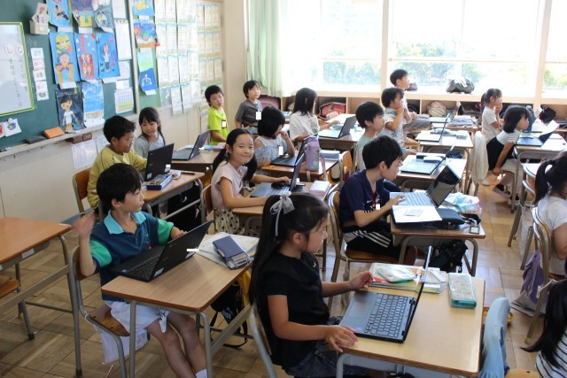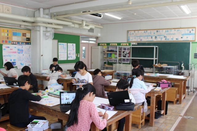 算数では分母の違う分数を通分して解いていました。また、低学年では科フートのアプリを活用していました。図工の授業では、読書感想画の色塗りをしていました。