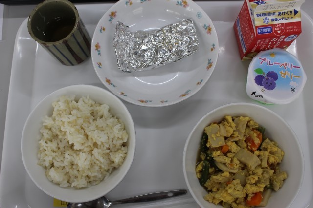 玄米ご飯 牛乳 高野豆腐のたまごとじ さばぎんがみやき ブルーベリーゼリー でした。