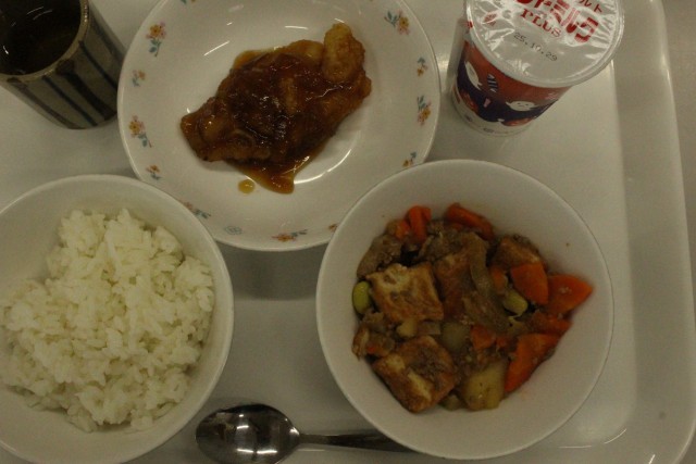 ご飯 はっこうにゅう じゃがいものぶたそぼろに 鶏肉とたまねぎのてりかけ でした。