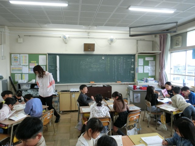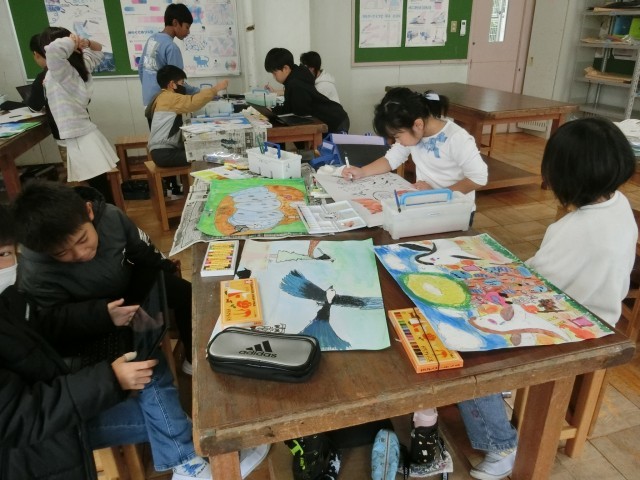 1年生は、中心に書くとよいことや気持ちをはっきり書くことなどを教わりながら、昨日の運動会のことを作文にしたためていました。2年生は国語の授業で、友達と相談したい話題をグループごとに決めていました。4年生は、読書感想画に取り組み、細部にこだわったり色使いを気にしたりしながら作品作りを進めていました。