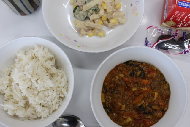 きのこのキーマカレー(本校児童が考えた料理) 麦ご飯 牛乳 シャキシャキポテトサラダ プルーン でした。 みんな「おいしい」と言いながらきのこのキーマカレーを食べていました。